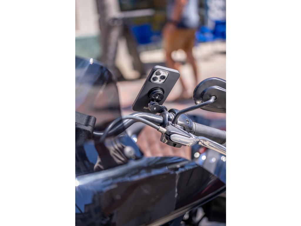 Napolohuj držák Bar Clamp Mount Pro na svých řídítkách. Držák z leteckého aluminia do svorek řídítek na motorce s plně nastavitelnou hlavou. Pomocí ramene si nastavíš náklon a zvolíš i orientaci telefonu.